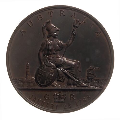 Plain (edge) AUSTRALIA/JANUARY 26 1788 Britannia, seated l., leaning on shield, lighthouse behind at l., ship at r. (obverse) ORTA RECENS QUAM PURA NITES/1888/AMOR Wreath of Australian flowers, Southern Cross, Rampant lion (reverse)