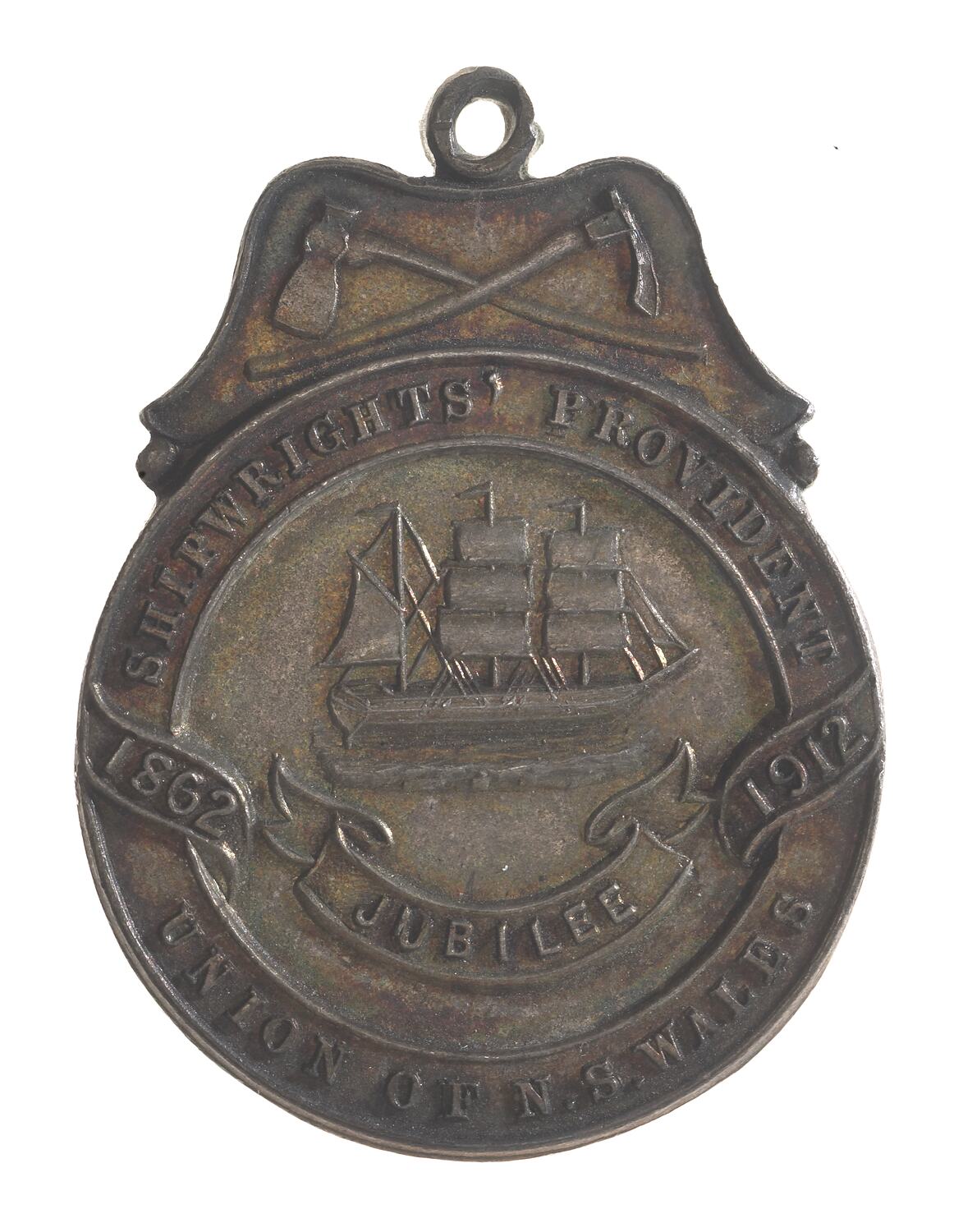 At centre within wide boarder, a ship under full sail right, below on ribbon, 1862 JUBILEE 1912; around, SHIPWRIGHTS' PROVIDENT UNION OF N.S. WALES above all shipwrights tools of axe and adze