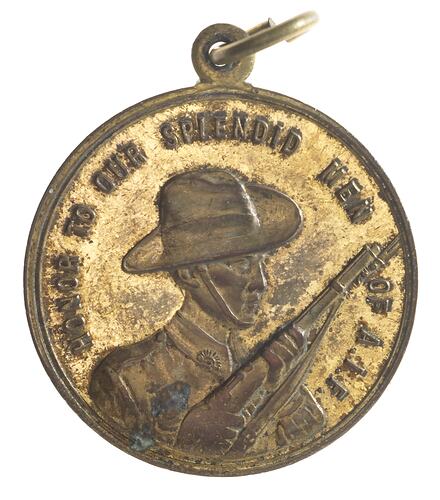 Round metal with loop and split ring at top. Obverse depicts an Australian infantry soldier in uniform with slouch hat, rising sun pin on collar and rifle held across body pointing to left shoulder. Reverse bears inscription in a circle.