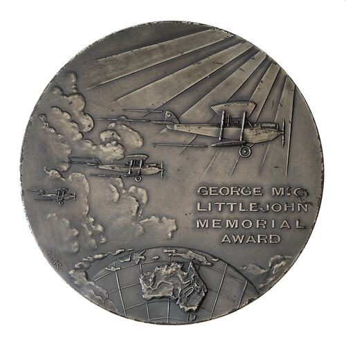 Specimen Littlejohn Memorial Award medal, not issued, made for the Royal Aero Club of New South Wales, circa 1935. In 1919 individual sections of the Australian Aero Club were formed in Victoria, New South Wales, Queensland and South Australia. This medal commemorates pilot George Littlejohn, who with Charles Ulm and Leon Skilling was attempting to survey a route from Oakland, California, to Sydney in Airspeed A.S.6 Envoy VH-UXY Stella Australis on Dec. 4 1934 when the plane was lost at sea off Hawaii.