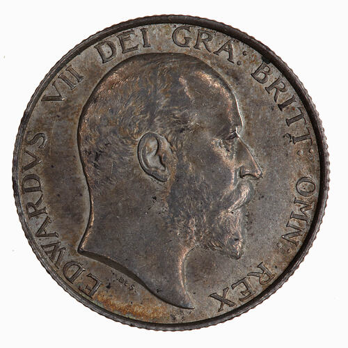 Bare head of the King facing right; below in small letters De S. (for G.W. De Saulles Mint Engraver); around, EDWARDVS VII DEI GRA: BRITT: OMN: REX FID: DEF: IND: IMP: