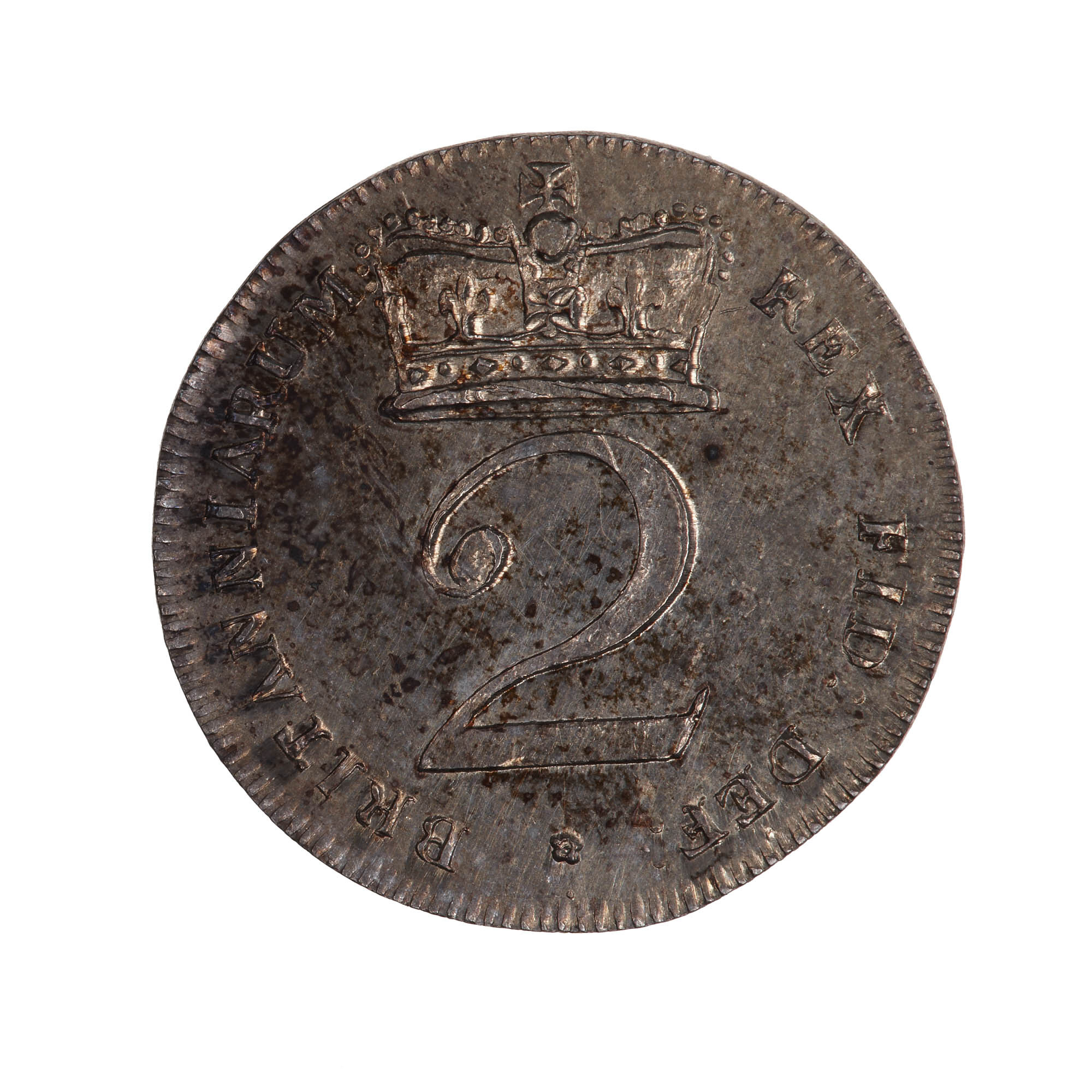 At centre a numeral 2 with a large crown above; around, REX FID DEF BRITANNIARUM the top of the crown divides the legend.