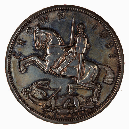 St. George wearing armour and holding a sword and shield (bearing the cross of St. George) on horseback advancing to left above a fallen dragon with broken lance in it's side; around above, CROWN 1935