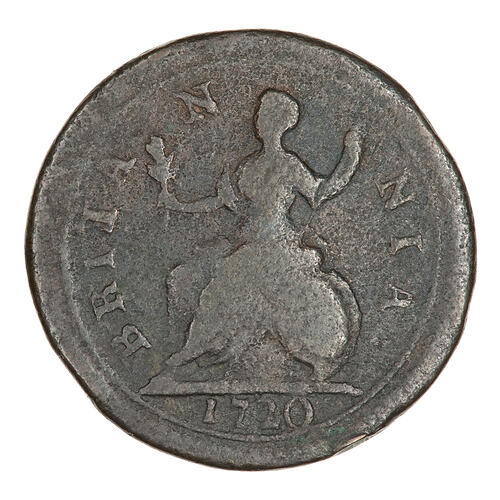 Britannia seated facing left holding an olive branch and a spear; resting at right, a shield; around, BRITANNIA.; in exergue, 1720