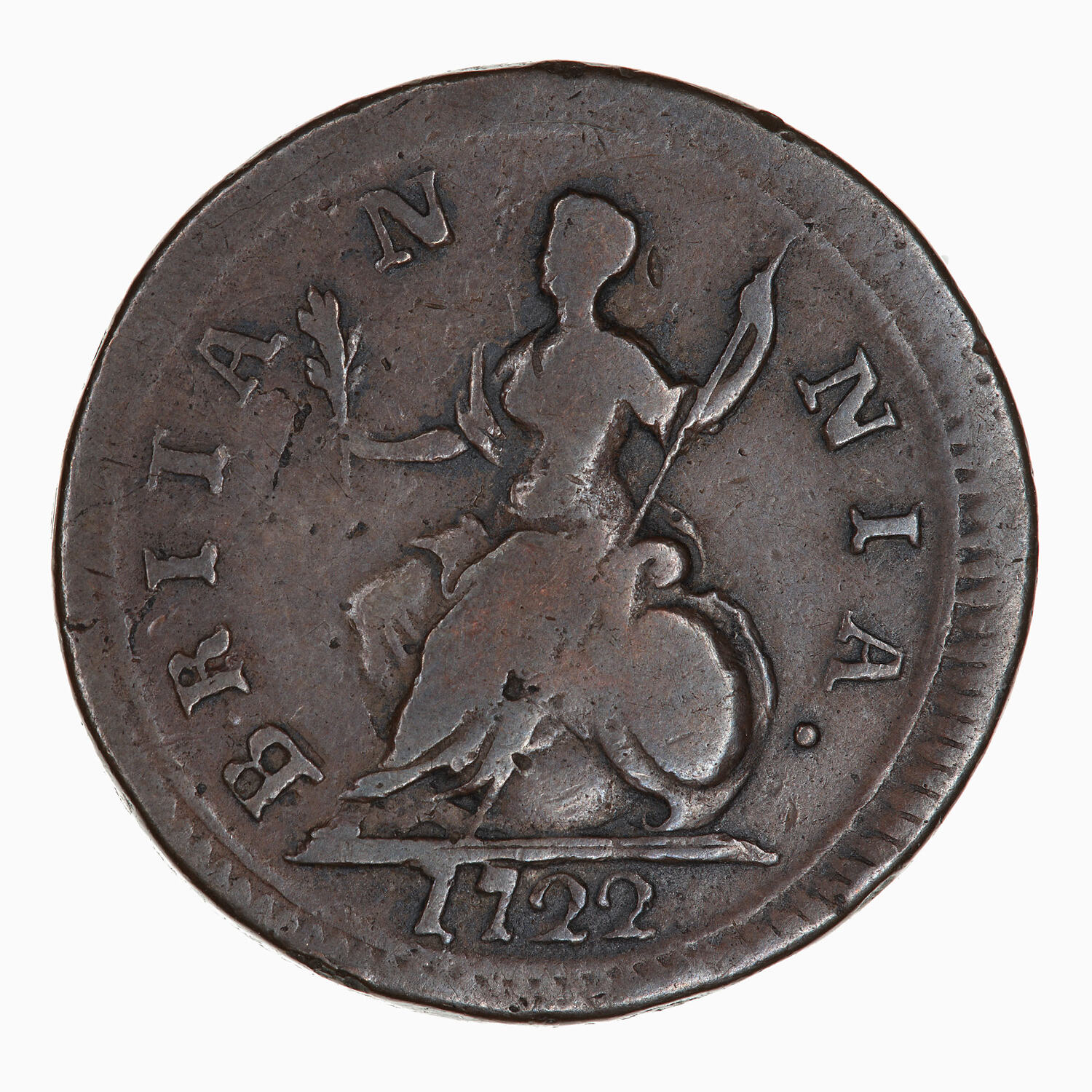 Britannia seated facing left holding an olive branch and a spear; resting at right, a shield; around, BRITANNIA.; in exergue, 1722