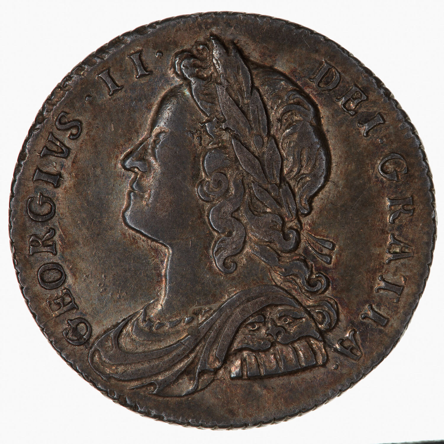 Young laureate bust of George II facing left wearing armour, with lion's head on shoulder; around, GEORGIVS II DEI GRATIA.