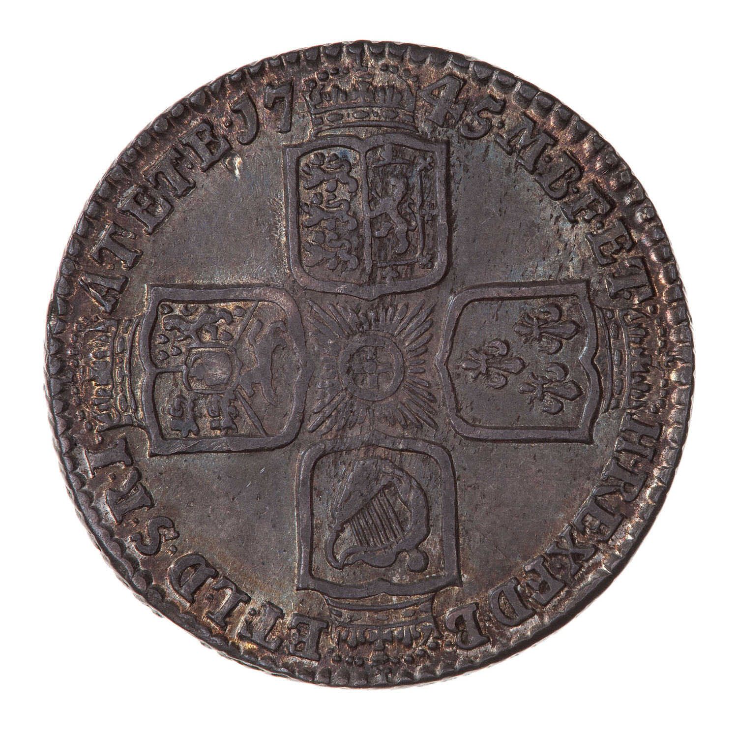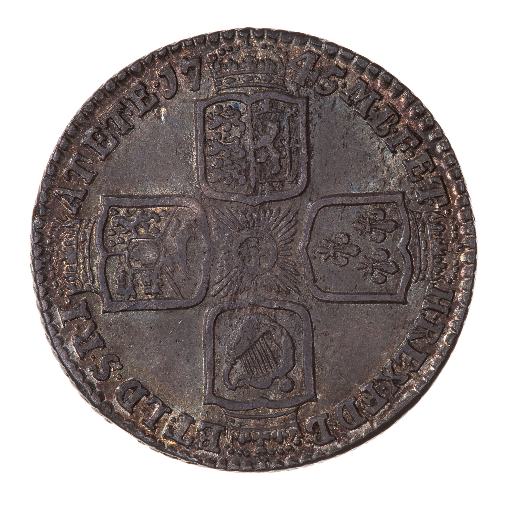 Four crowned shields arranged to form a cross, England and Scotland impaled, France, Ireland and the Electorate of Brunswick and Luneburg; Star of the Garter at the centre; around, M B F ET H REX F D B ET L D S R I A T ET E 1745, the date being broken by a crown. (Translation obverse and reverse: George II by the Grace of God King of Great Britain, France and Ireland, Duke of Brunswick and Luneburg, Archi-Thesaurius and Elector of the Holy Roman Empire).