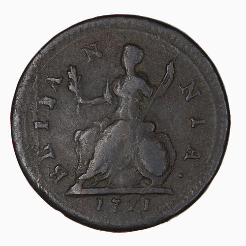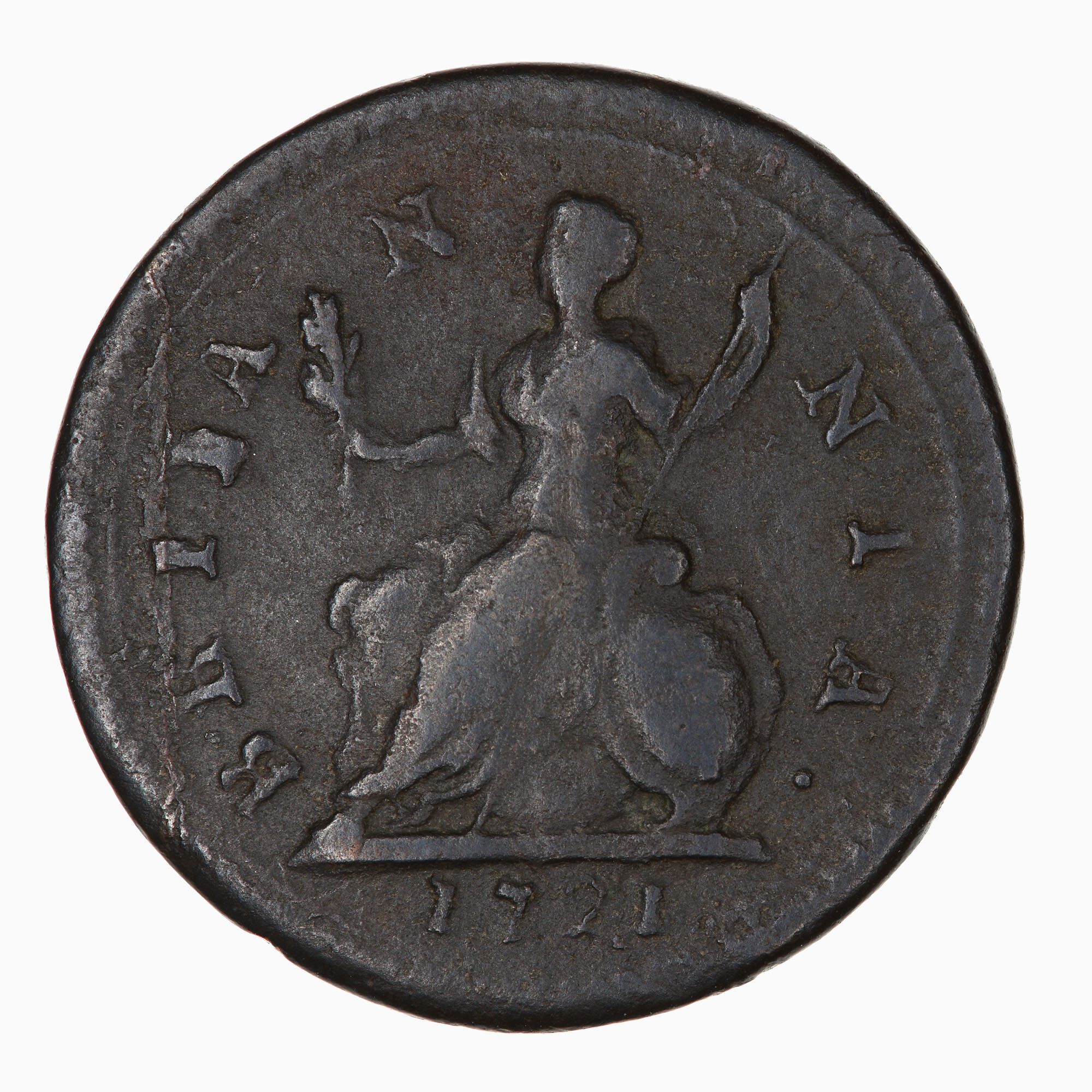 Britannia seated facing left holding an olive branch and a spear; resting at right, a shield; around, BRITANNIA.; in exergue, 1721