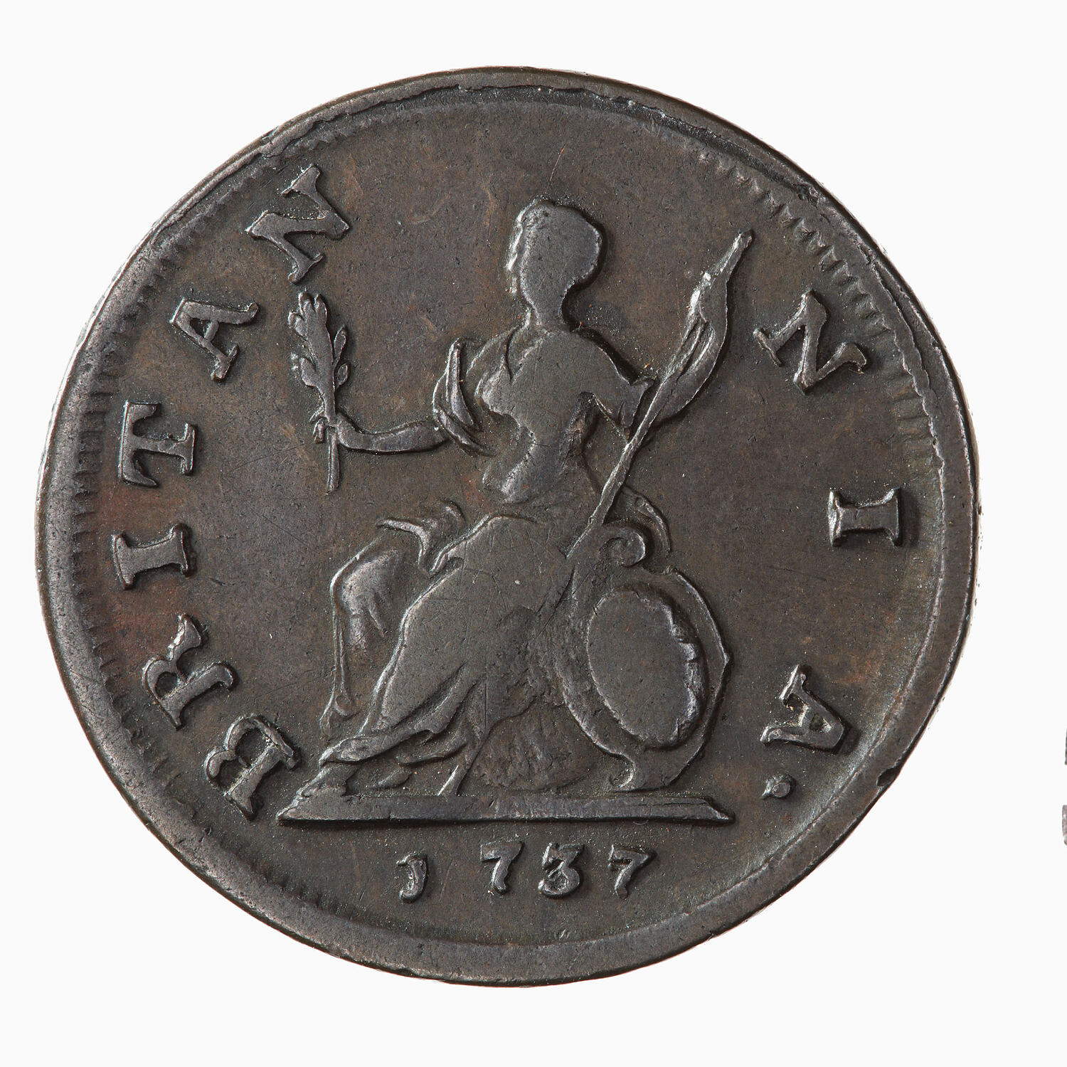 Britannia seated facing left on globe, extending olive branch and holding spear, by her side rests a shield decorated with the combined crosses of St. George and St. Andrew; around, BRITANNIA.; in exergue, 1737