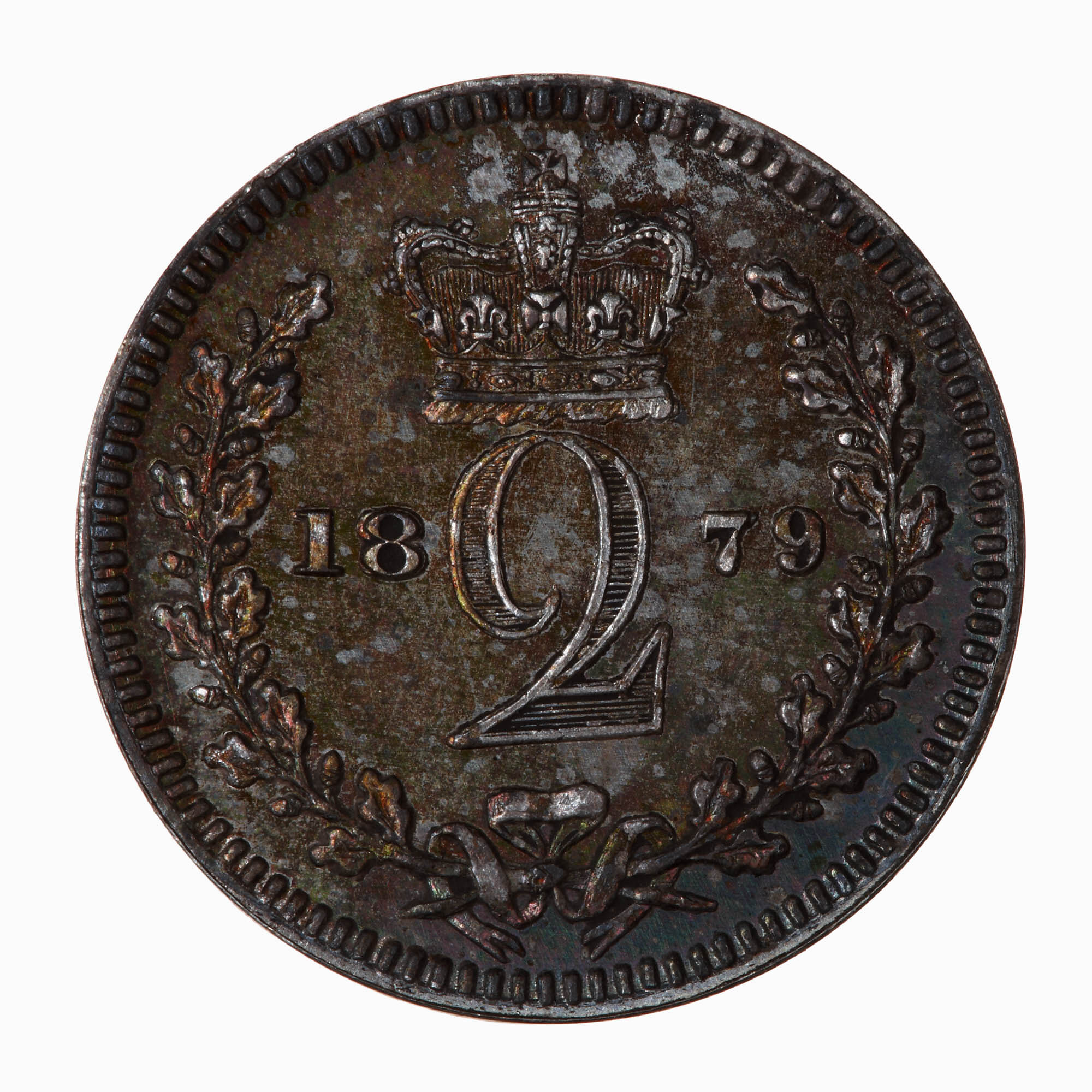 At centre within an open oak wreath; the numeral 2; above, crown; the numeral dividing the date 1879