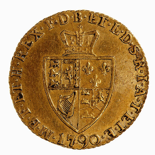 Crowned spade-shaped shield quartered with the arms of England and Scotland impaled, France, Ireland and the Electorate of Brunswick and Luneburg; around, M B F ET H REX F D B ET L D S R I A T ET E; below shield, 1790. (translation from obverse to reverse, George III by the Grace of God King of Great Britain, France and Ireland, Duke of Brunswick and Luneberg, Archi-Thesaurius and Elector of the Holy Roman Empire).