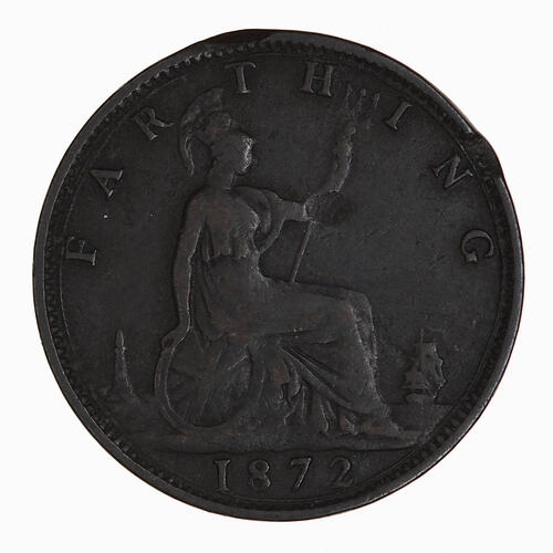 Britannia seated facing right on a rock wearing a helmet and breastplate with flowing dress; she holds a trident and rests her right hand on a shield which bears the combined crosses of the Union Flag; at right a ship sailing away; at left, a lighthouse; around, FARTHING; in exergue, 1872