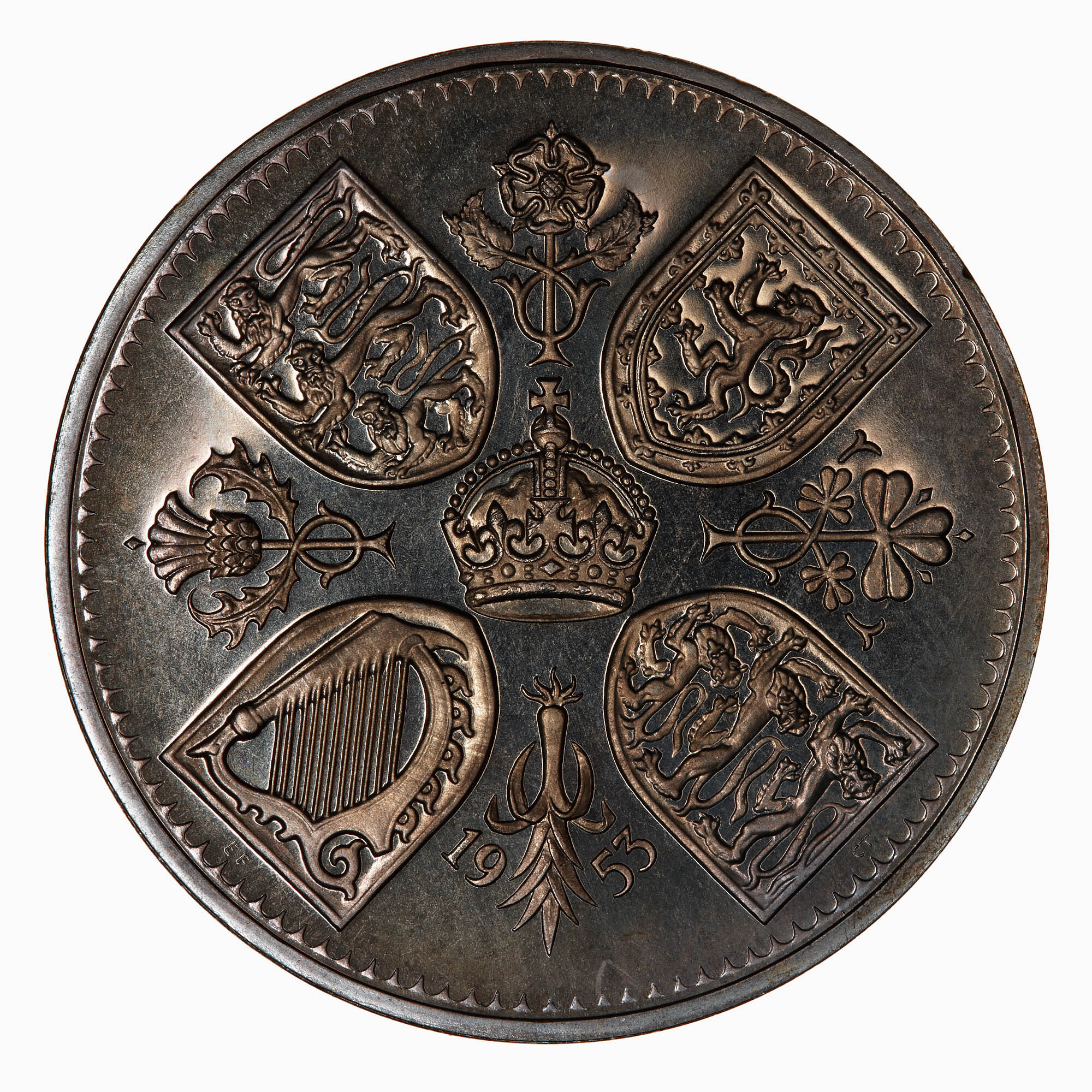 A crown is a 5 shilling coin. This commemorative crown was issued to commemorate the Coronation of Elizabeth II, 2 June 1953. This is a proof-of-record strike of the issue. The equestrian obverse was adapted from the Great Seal of the Realm.