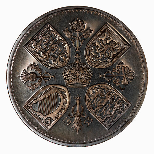 Four flat topped shields forming a diagonal cross around a crown, the shields bear the arms of England (top left and bottom right), Scotland (top right) and Ireland (bottom left); between shields, a rose, shamrock, leek and thistle; the leek divides the date 1953