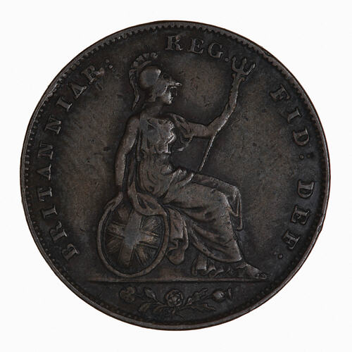 Britannia seated facing right on a rock holding a trident and resting her right hand on an oval shield which bears the three crosses of the Union Flag; around, BRITANNIAR: REG: FID: DEF:; in exergue, a rose, thistle and shamrock combined.