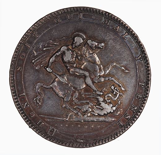 At centre St. George, wearing a helmet and cape and holding a sword, on horseback charging to right attacking a dragon lying below the horse with a broken lance in its side; in exergue in small letters, the artist's name, PISTRUCCI; encircling all, the Garter with motto HONI SOIT QUI MAL Y PENSE