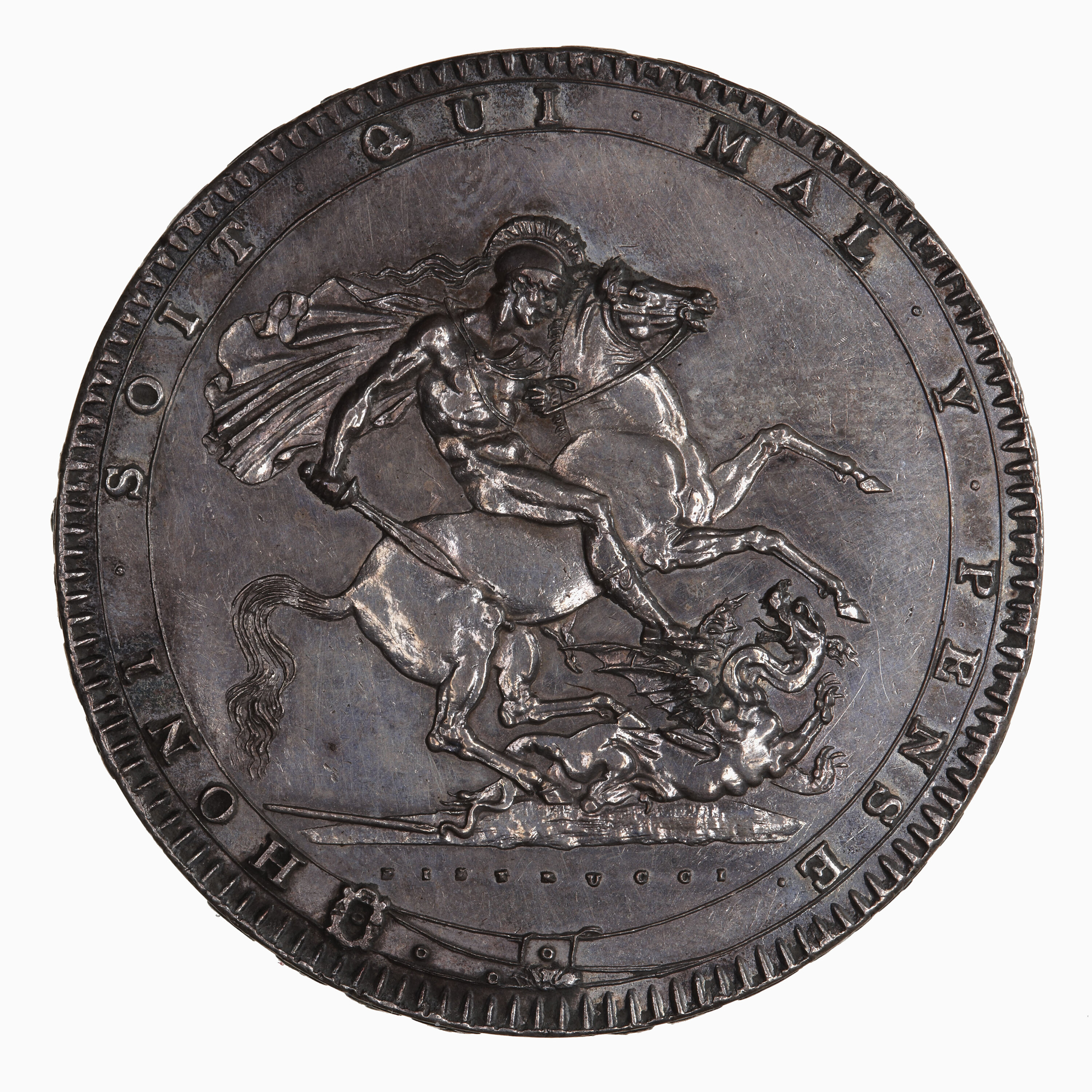 At centre St. George, wearing a helmet and cape and holding a sword, on horseback charging to right attacking a dragon lying below the horse with a broken lance in its side; in exergue in small letters, the artist's name, PISTRUCCI; encircling all, the Garter with motto HONI SOIT QUI MAL Y PENSE