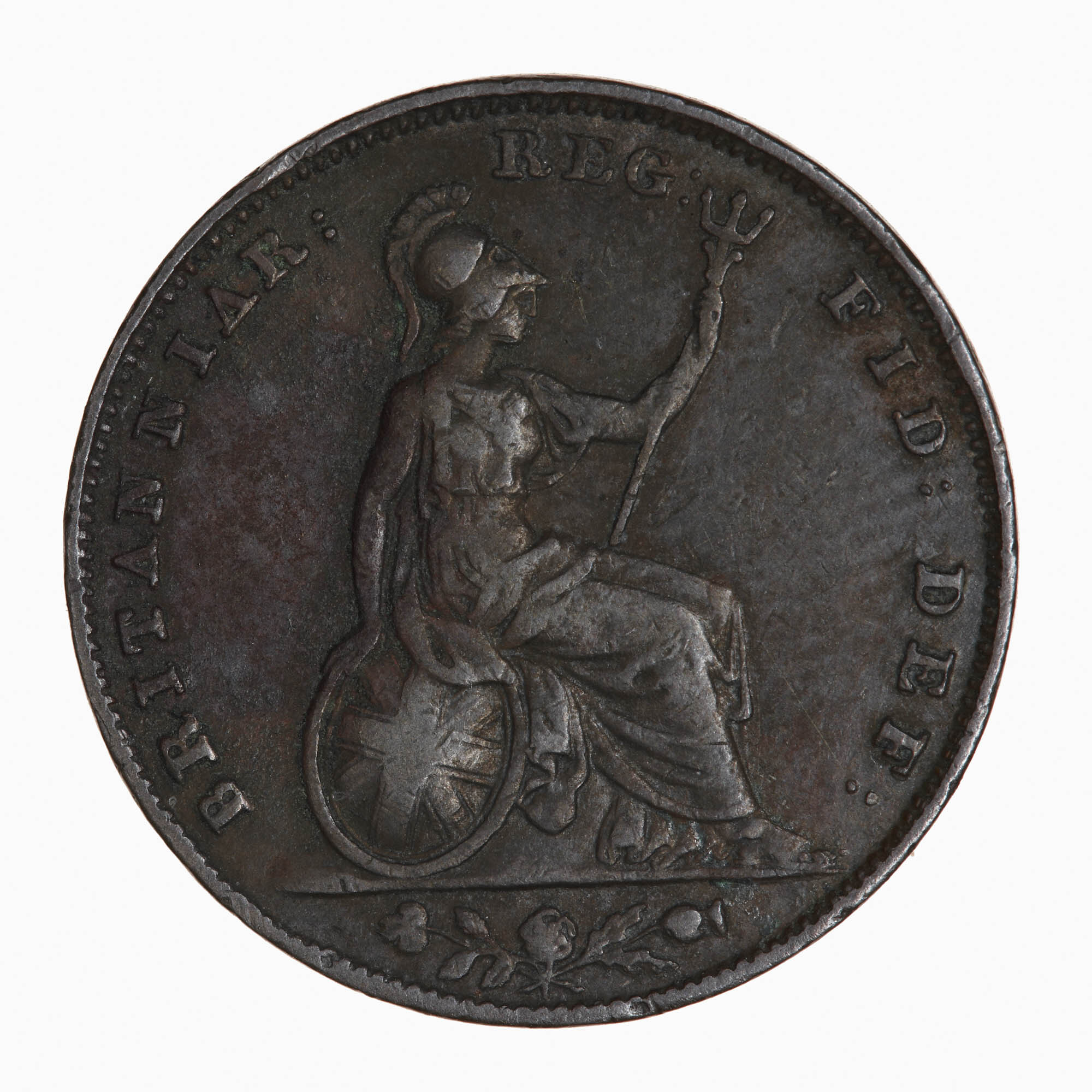 Britannia seated facing right on a rock holding a trident and resting her right hand on an oval shield which bears the three crosses of the Union Flag; around, BRITANNIAR: REG: FID: DEF:; in exergue, a rose, thistle and shamrock combined.