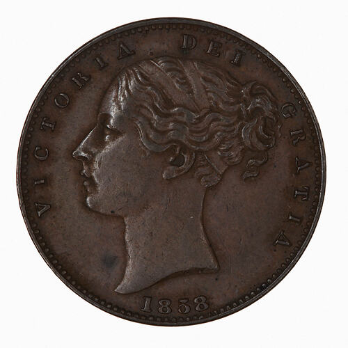 Head of the Queen facing left, hair bound in double fillet gathered behind in a knot from which a loose curl; on neck truncation incuse, W.W. (for William Wyon, who designed and engraved the dies); around, VICTORIA DEI GRATIA; below, 1858