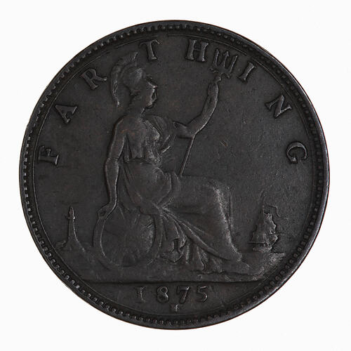Britannia seated facing right on a rock wearing a helmet and breastplate with flowing dress; she holds a trident and rests her right hand on a shield which bears the combined crosses of the Union Flag; at right a ship sailing away; at left, a lighthouse; around, FARTHING; in exergue, 1875; below date the mint mark, H