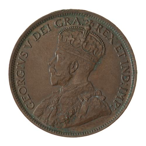 Crowned and draped bust of the King facing left; around, GEORGIVS V DEI GRA: REX ET IND: IMP:; artist's initials, B.M., on bust truncation