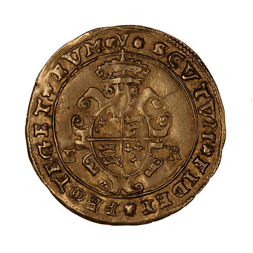 A crowned oval garnished shield quartered with the arms of England and France, dividing ER; around (mm Y) SCVTVM FIDEI PROTEGET EVM (translation: The shield of faith shall protect him)