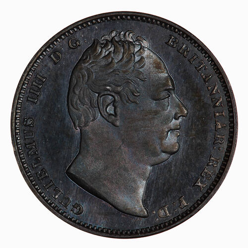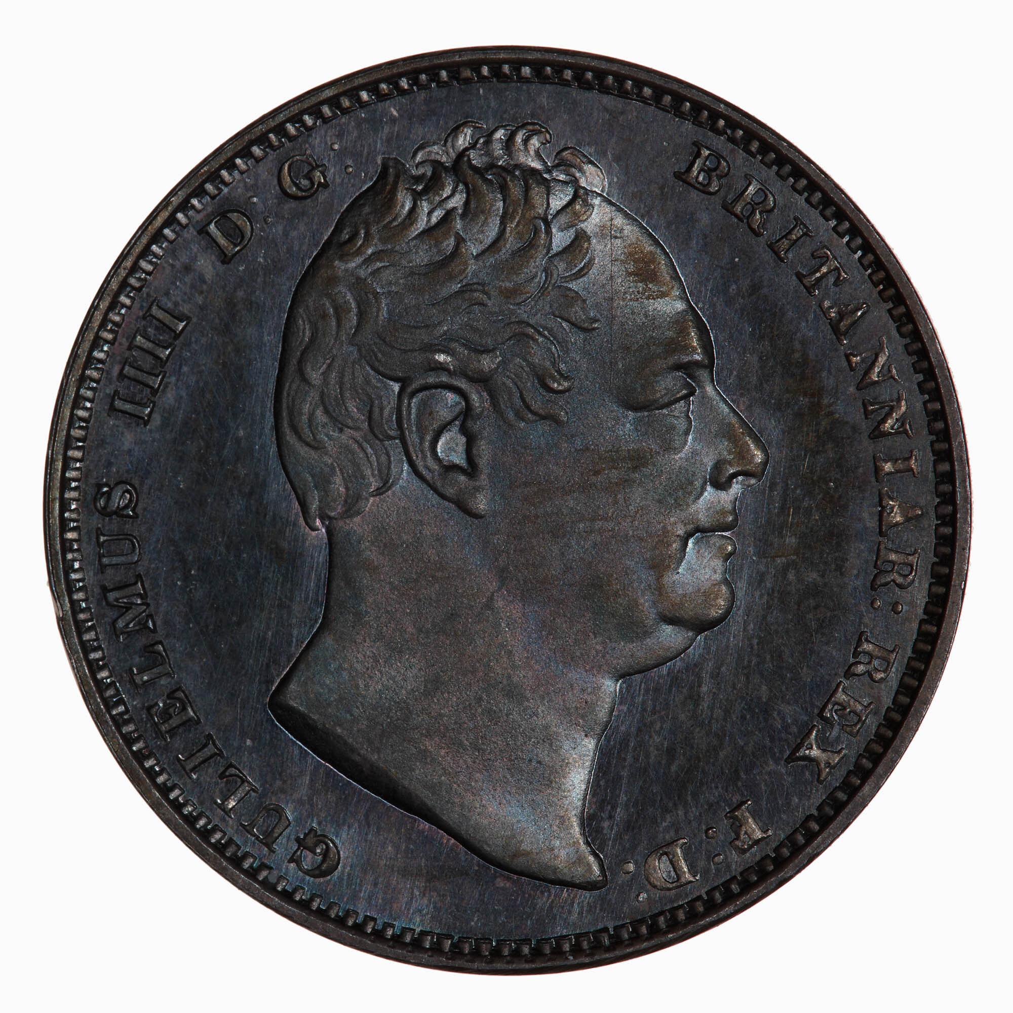 Bare head of William IV facing right; around, GULIELMUS IIII D:G: BRITANNIAR: REX F: D: