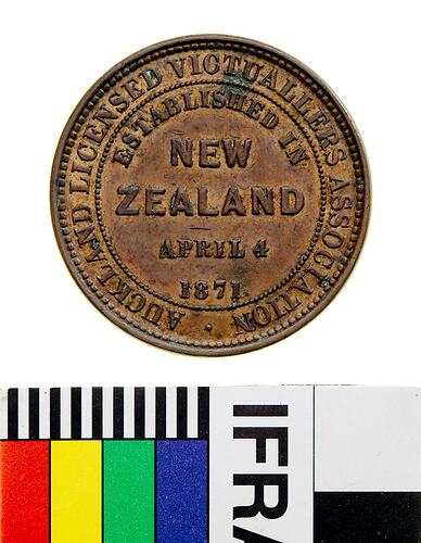 Copper One Penny Token, minted by Allan & Moore, London. Issued by Auckland Licensed Victuallers Association, Auckland, 1871. The Auckland Licensed Victuallers Association issued penny tokens celebrating the formation of their organisation in 1871, and provided coins for giving change to hotel patrons in the city. The New Zealand Licensed Victuallers Association, of which the Auckland association was a part, joined the Hospitality Association of New Zealand in the late twentieth century.