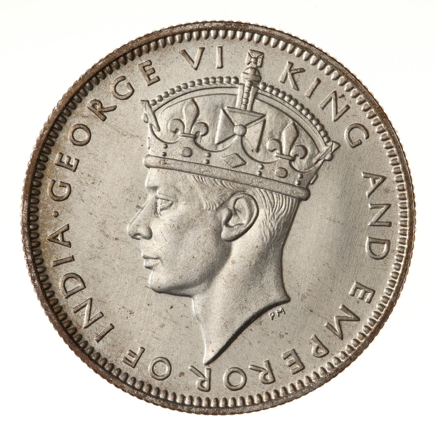Crowned head of the King facing left; around, GEORGE VI KING AND EMPEROR OF INDIA; artist's initials, PM, below neck