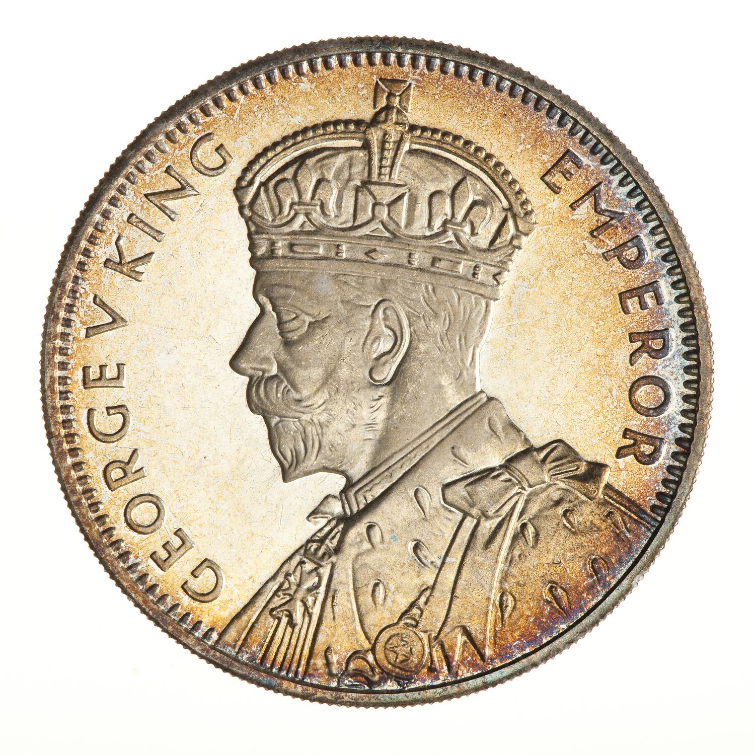 Crowned and draped bust of the King facing left and extending to the rim of the coin, the King is wearing the Imperial Crown and the ermine Robe of State and the Badge of the Most Honourable Order of the Bath; around, GEORGE V KING EMPEROR