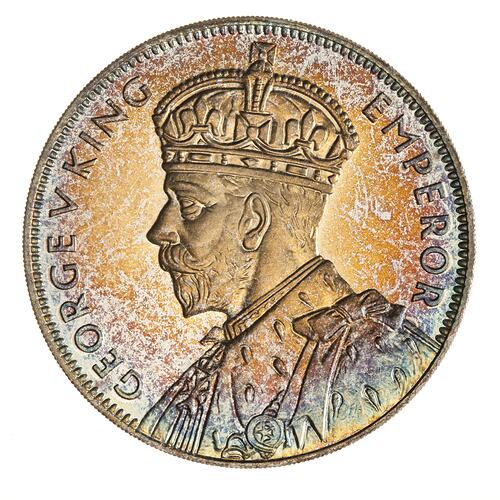 Crowned and draped bust of the King facing left and extending to the rim of the coin, the King is wearing the Imperial Crown and the ermine Robe of State and the Badge of the Most Honourable Order of the Bath; around, GEORGE V KING EMPEROR