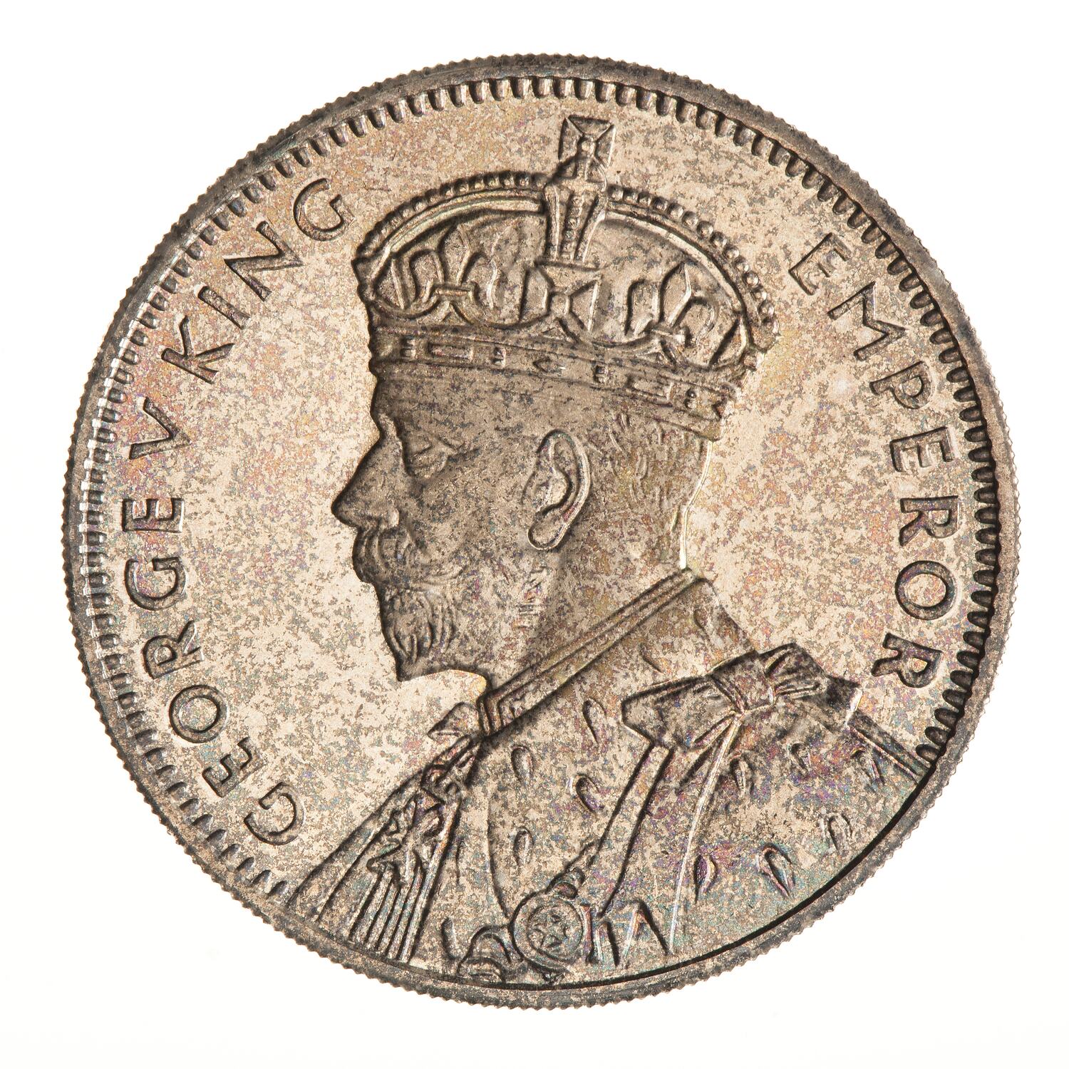 Crowned and draped bust of the King facing left and extending to the rim of the coin, the King is wearing the Imperial Crown and the ermine Robe of State and the Badge of the Most Honourable Order of the Bath; around, GEORGE V KING EMPEROR