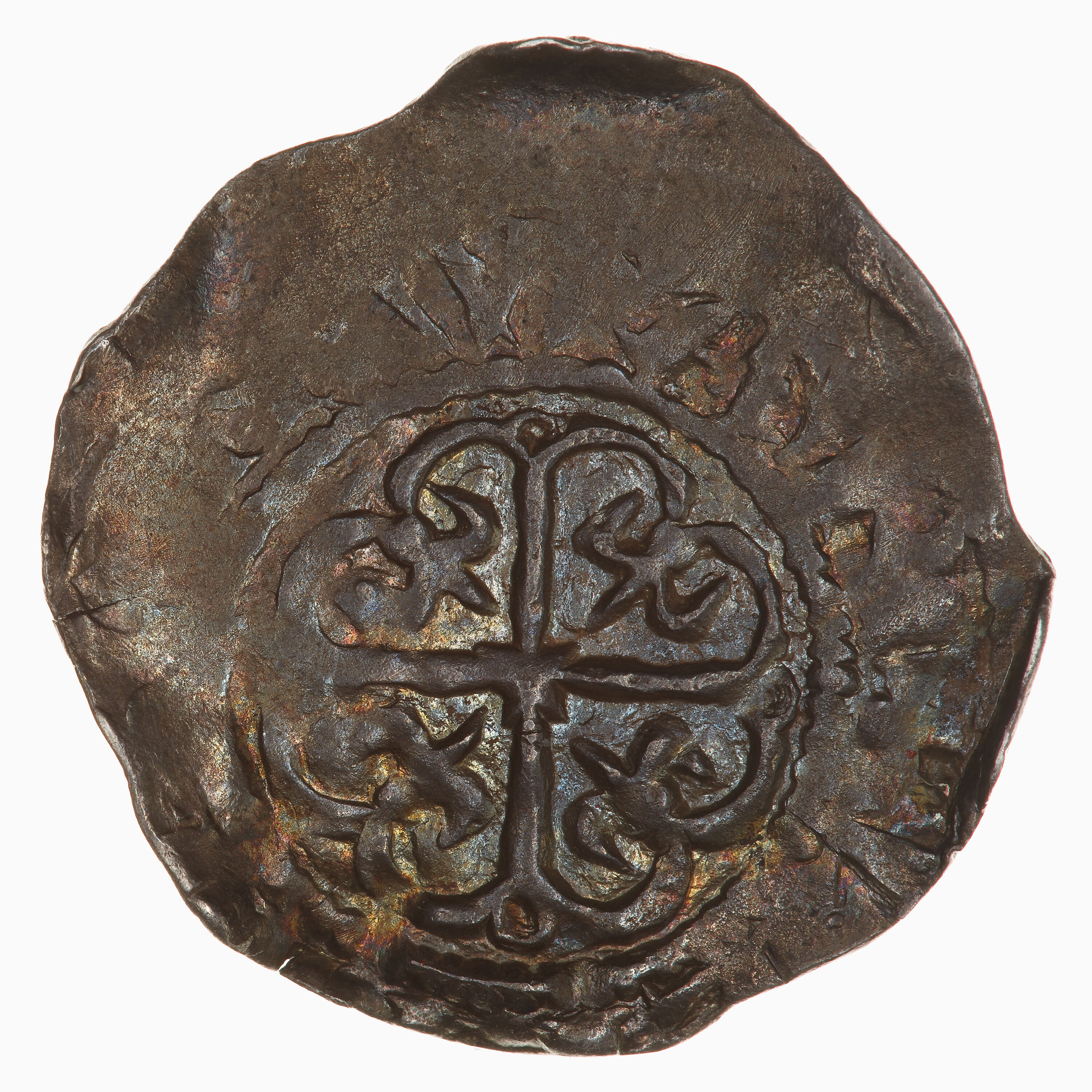 At the centre within a line circle a cross moline with a fleur-de-lis in each angle; around; +E...WAR (letters on both sides are quite difficult or impossible to read being either weakly struck up or off the flan).