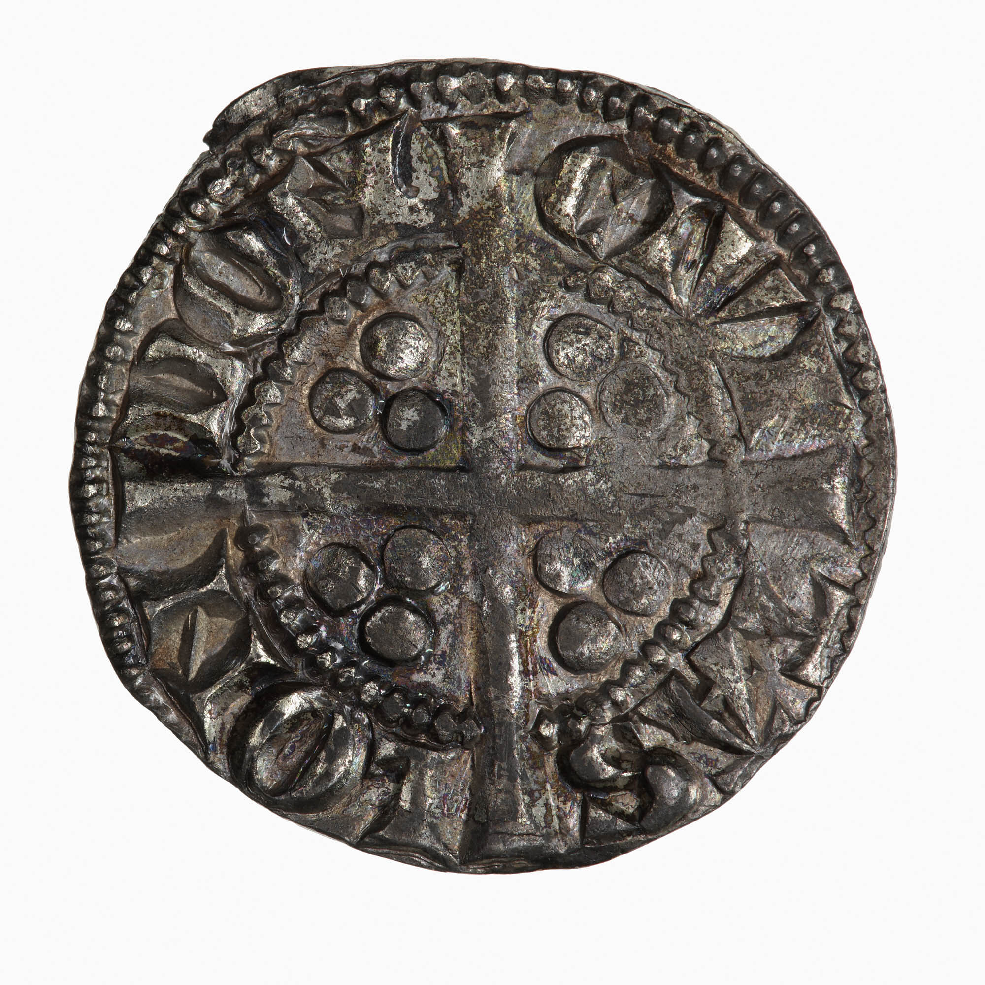 A long cross with three pellets in each angle; around outside a circle, CVI TAS LON DON