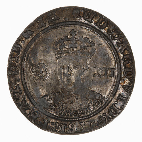Crowned bust of the King facing with rose at left and denomination in pence, XII, at right; around, (mm. tun) EDVVARD VI D G AGL FRA Z hIB REX (translation: Edward VI by the Grace of God King of England, France and Ireland)