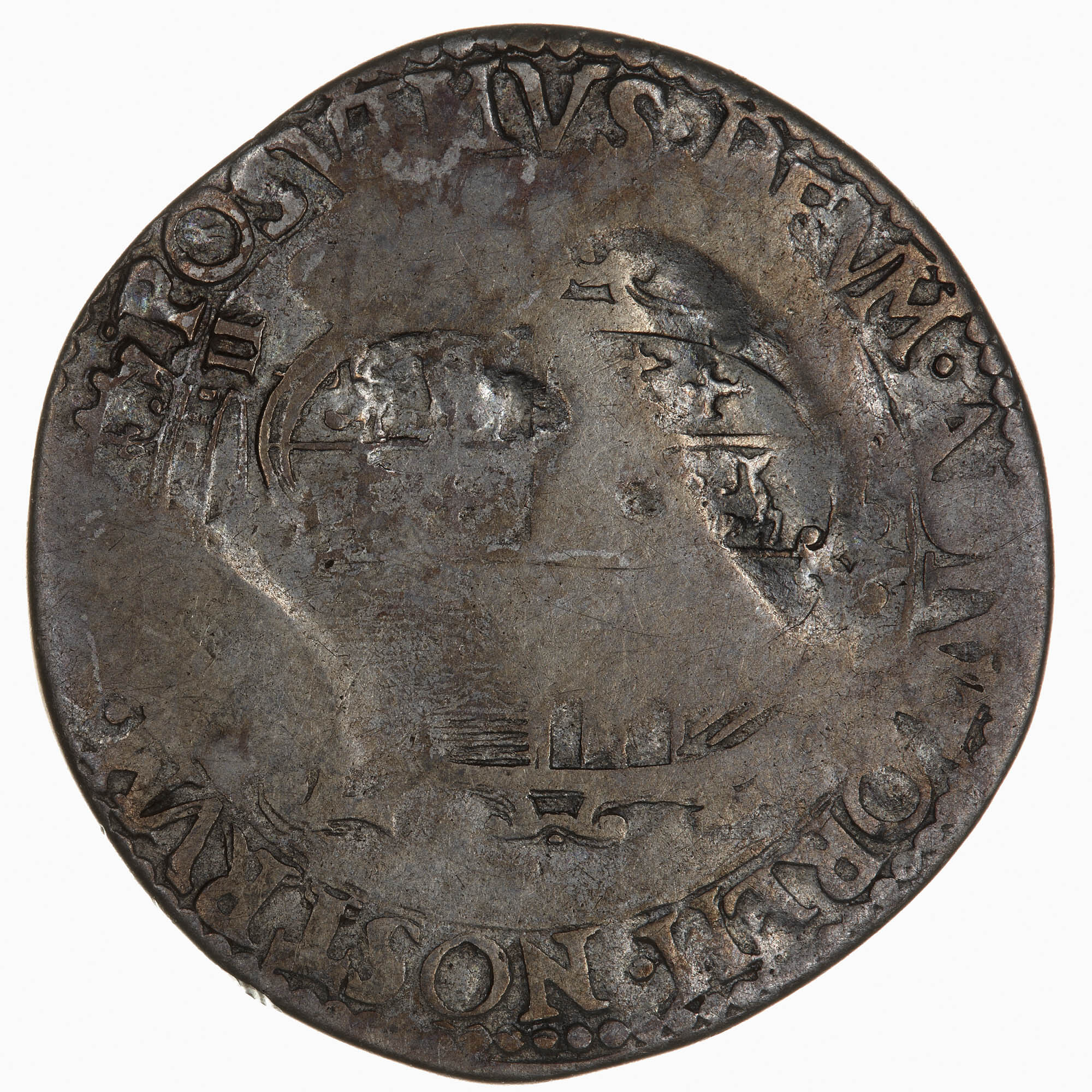 Crowned and garnished oval shield bearing the arms of Spain, England and France; the crown divides the mark of value, XII (12 pence); around, POSVIMVS DEVM ADIVTOREM NOSTRVM (translation: We have made God our helper)