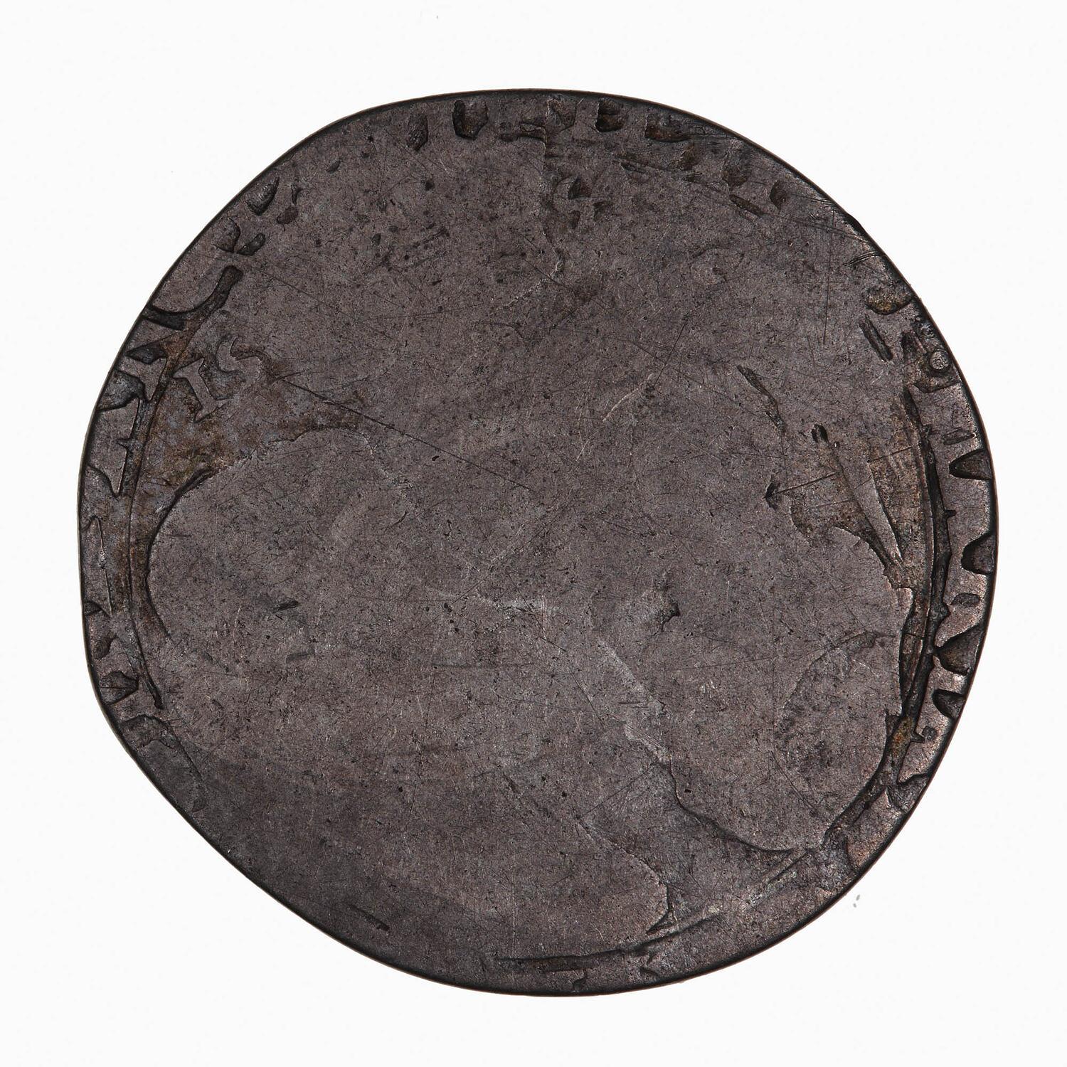 Crowned and garnished oval shield bearing the arms of Spain, England and France; the crown divides the mark of value, XII (12 pence); around, the base of the letters of the legend, POSVIMVS DEVM ADIVTOREM NOSTRVM (translation: We have made God our helper)
