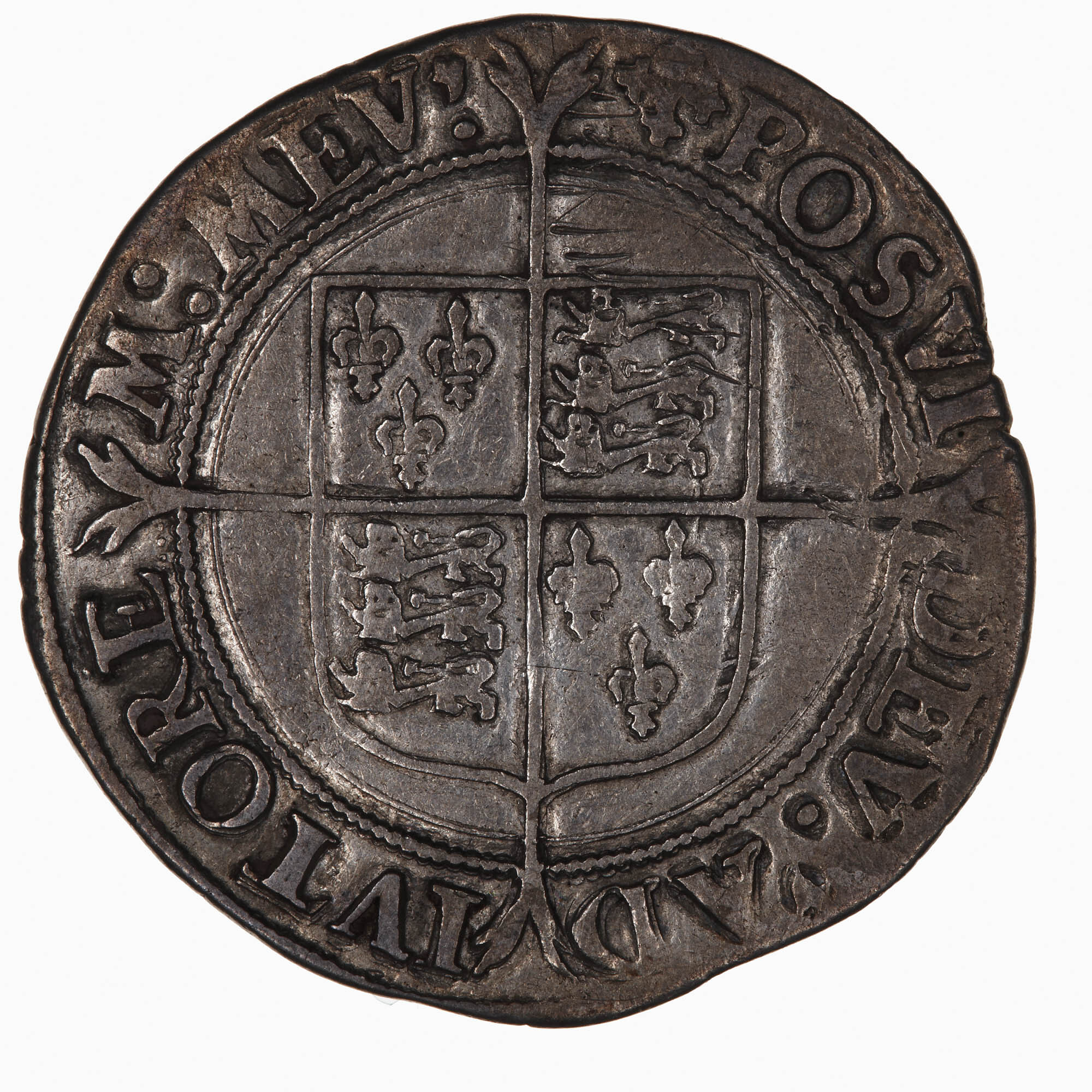 Within a bead circle a plain square top shield quartered with the arms of France (1 & 4) and England (2 & 3), over a long cross fourchee; around, (mm. cross crosslet) POSVI DEV ADIVTOREM MEV (translation, I have made God my helper)