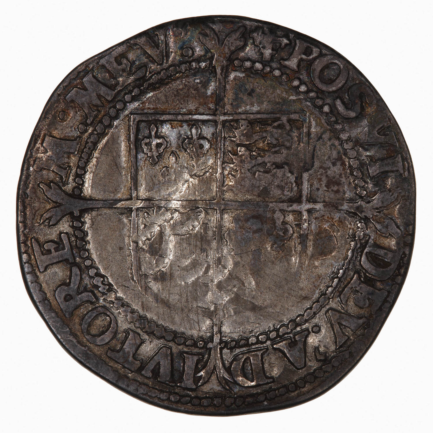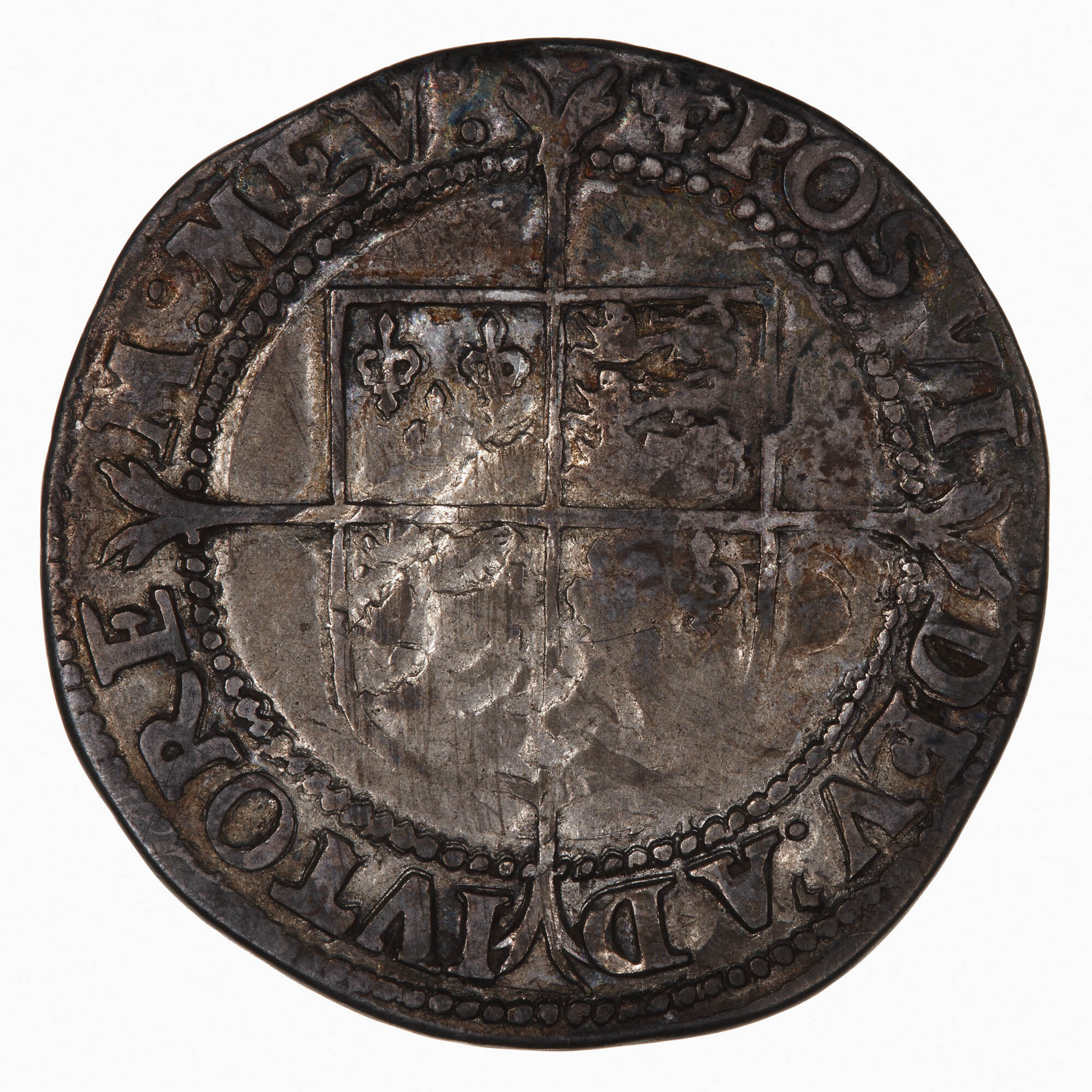 Within a bead circle a plain square top shield quartered with the arms of France (1 & 4) and England (2 & 3), over a long cross fourchee; around, (mm. cross crosslet) POSVI DEV ADIVTOREM MEV (translation, I have made God my helper)