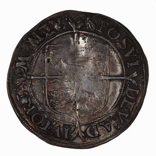Within a bead circle a plain square top shield quartered with the arms of France (1 & 4) and England (2 & 3), over a long cross fourchee; around, (mm. martlet) POSVI DEV ADIVTOREM MEV (translation, I have made God my helper)