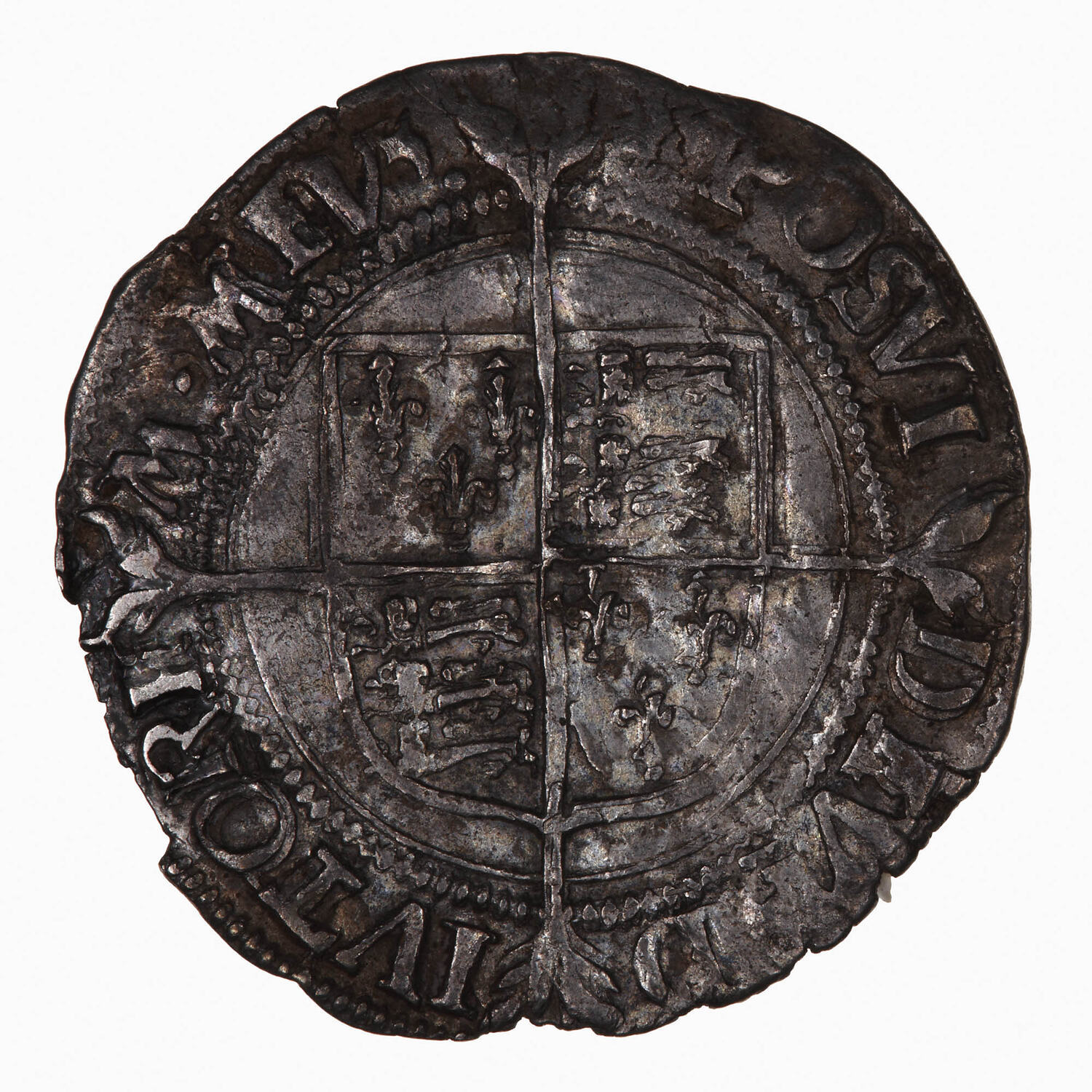 Within a bead circle a plain square top shield quartered with the arms of France (1 & 4) and England (2 & 3), over a long cross fourchee; around, (mm. lis) POSVI DEV ADIVTOREM MEV (translation, I have made God my helper)