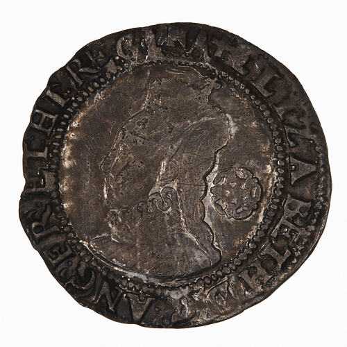 Within an inner bead circle, crowned bust of the Queen, wearing ruff and decorated dress, facing left; behind, rose; around, (mm. cross) ELIZABETH D G ANG FR ET HI REGINA