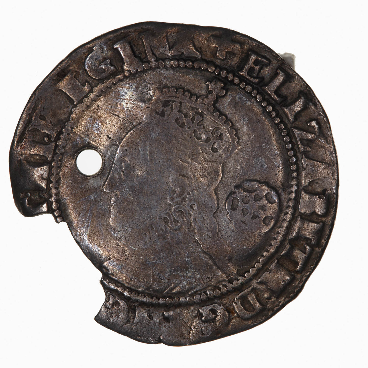 Within an inner bead circle, crowned bust of the Queen, wearing ruff and decorated dress, facing left; behind, rose; around, (mm. cross) ELIZABETH D G ANG [FR E]T HIB REGINA