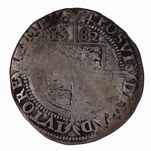 Within a bead circle a plain square top shield quartered with the arms of France (1 & 4) and England (2 & 3), over a long cross fourchee; above, 1582; around, (mm. sword) POSVI DEV ADIVTOREM MEV (translation, I have made God my helper)