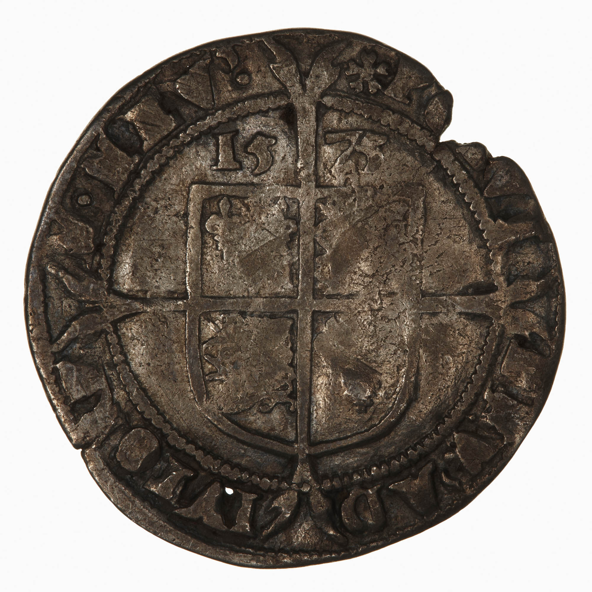 Within a beaded circle a plain square top shield quartered with the arms of France (1 & 4) and England (2 & 3), over a long cross fourchee; above, 1575; around, (mm. eglantine) POSVI DEV ADIVTOREM MEV (translation, I have made God my helper)