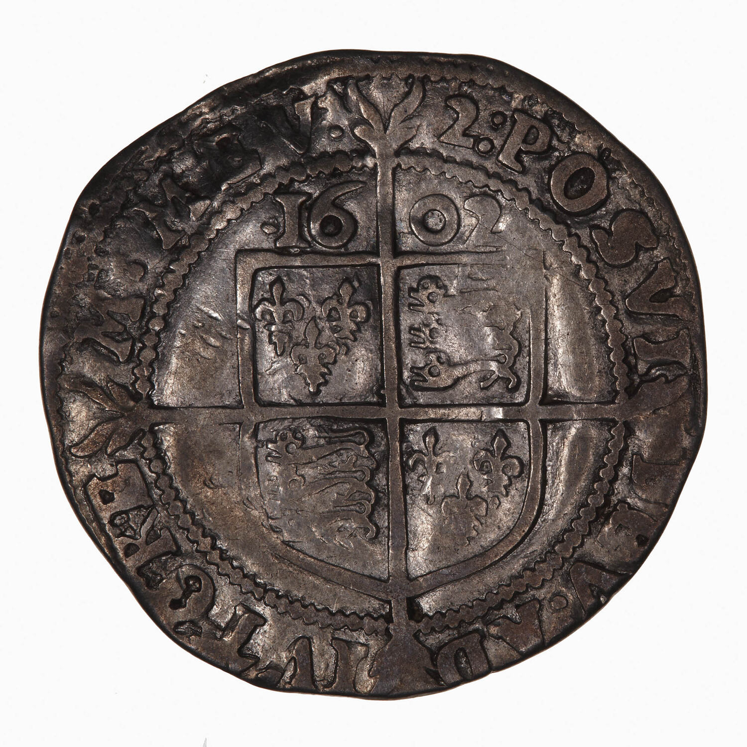 Within a bead circle a plain square top shield quartered with the arms of France (1 & 4) and England (2 & 3), over a long cross fourchee; above, 1602; around, (mm. 2) POSVI DEV ADIVTOREM MEV (translation, I have made God my helper)