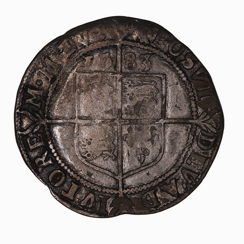 At centre within a beaded circle and over a long cross fourchee, a plain square topped shield quartered with the arms of France (1 & 4) and England (2 & 3); above, 1583; around, (mm. A) POSVI DEV ADIVTOREM MEV (translation, I have made God my helper)