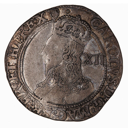 Crowned bust of the King facing left wearing a lace collar and armour; behind, the denomination in pence in Roman numerals, XII; around, CAROLVS D G MAG BR FR ET HI REX (mm. harp)