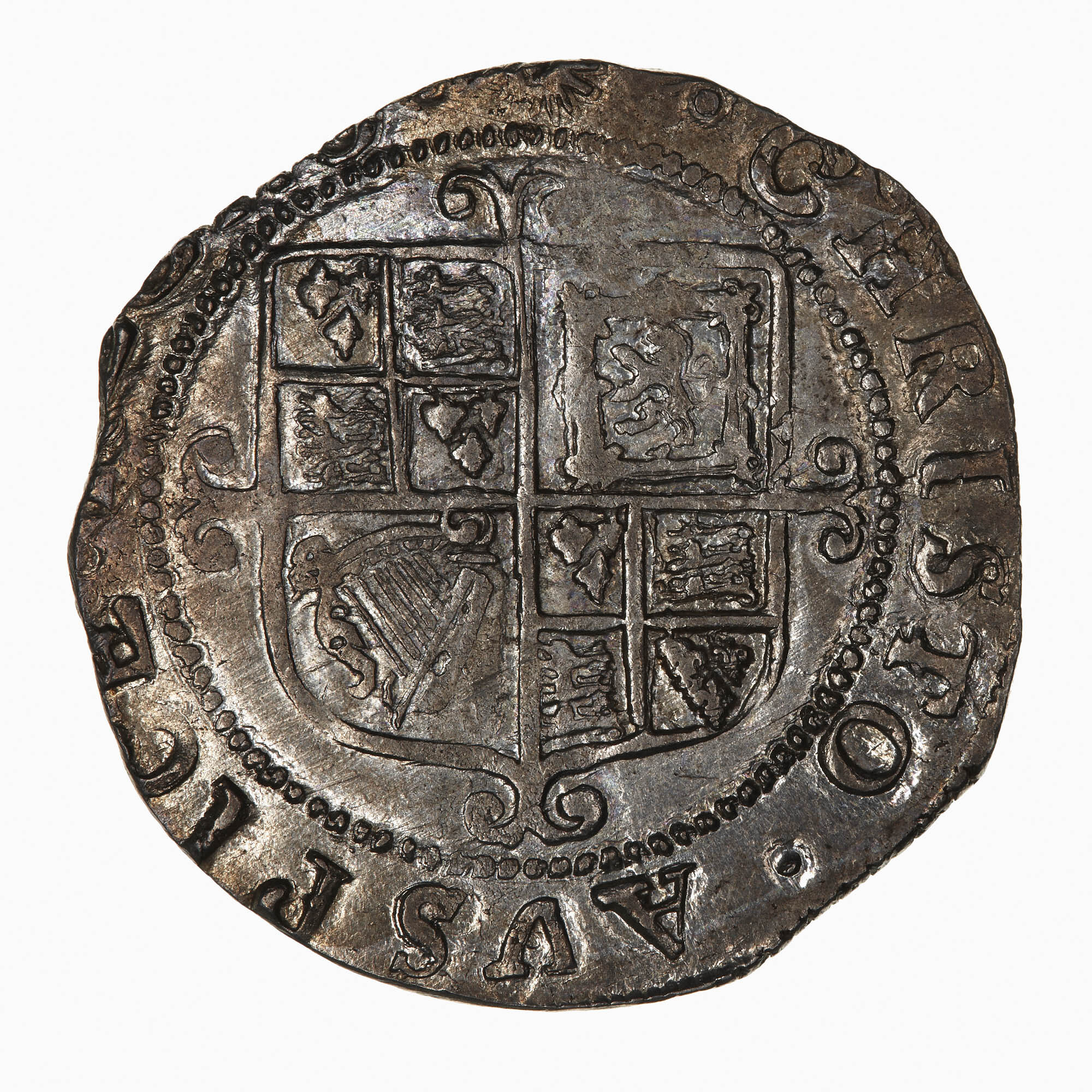 Flat topped shield quartered with combined arms of England and France (1st and 4th), Scotland and Ireland over a cross moline; around, CHRISTO AVSPICE REGNO (mm. sun) (translation: I reign under the auspices of Christ)