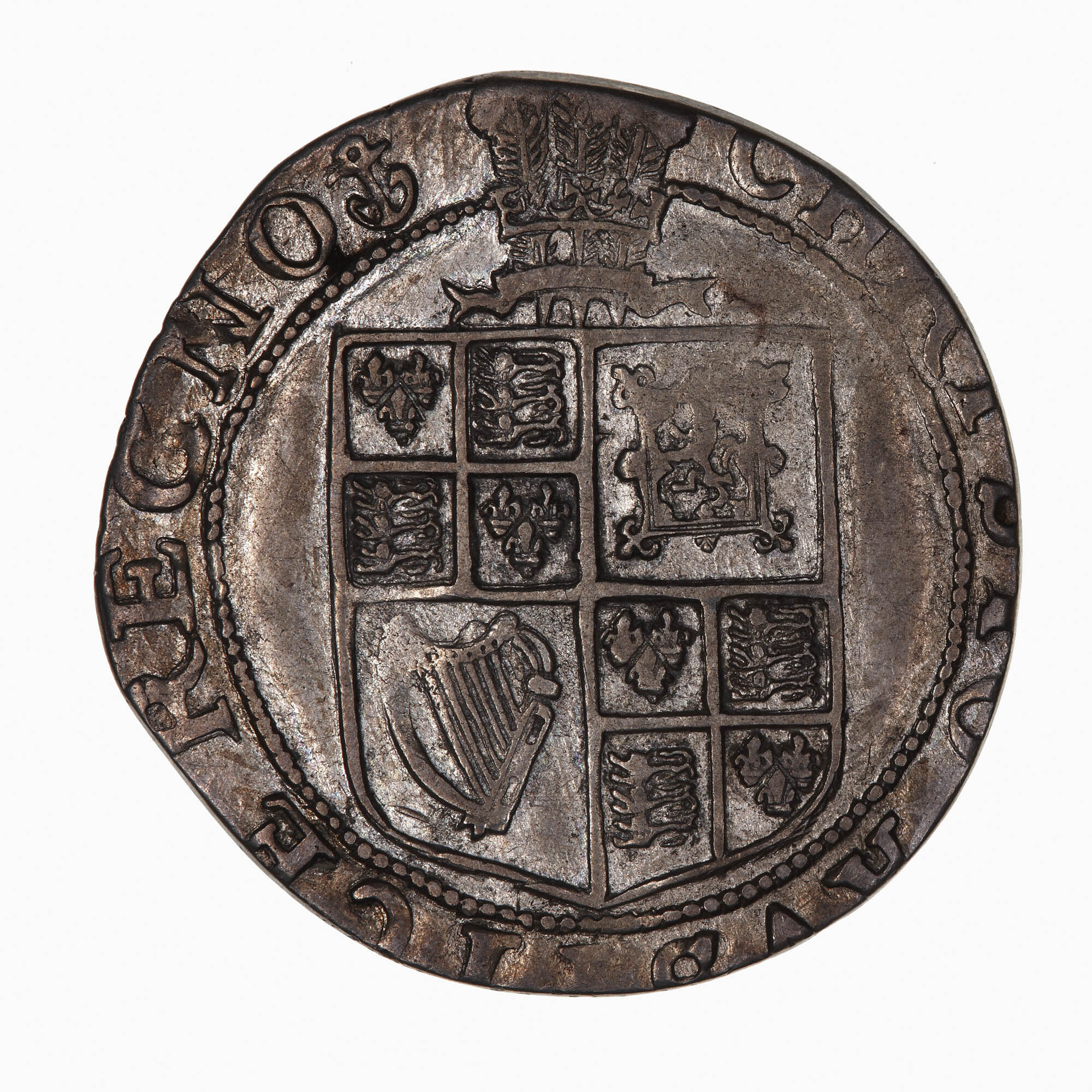 Flat topped shield quartered with combined arms of England and France (1st and 4th), Scotland and Ireland; plume above shield; around, CHRISTO AVSPICE REGNO (mm. anchor) (translation: I reign under the auspices of Christ)